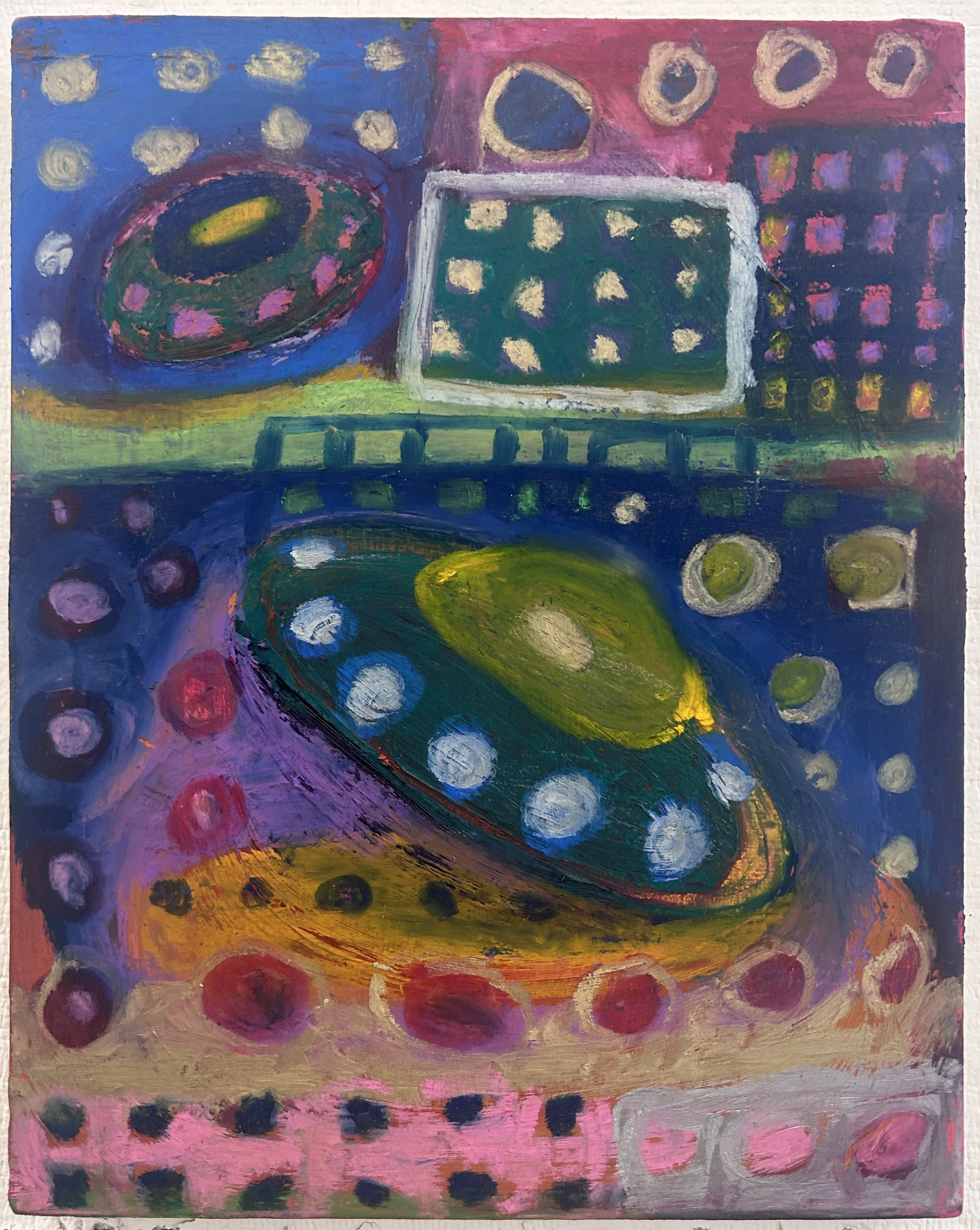 UFOs 10x8" Acrylic, oil, and oil pastel on panel